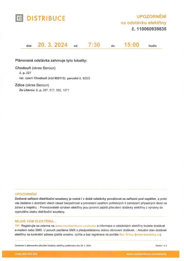 ČEZ Distribuce - oznámení o přerušení dodávky el. energie dne 20.3. 2024 od 7:30 do 15:00 hodin v lokalitě Chodouň čp. 227 par.č. 922/2 a lokalita Zdice Za Litavou čp. 287, 517, 592, 1071