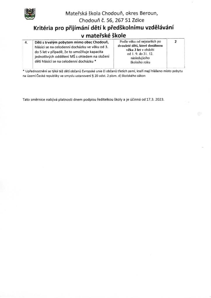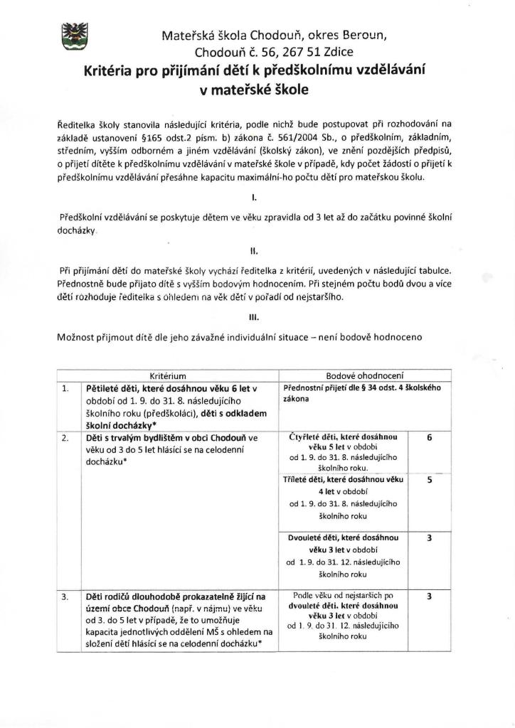 Kritéria pro přijímání dětí k předškolnímu vzdělávání v MŠ