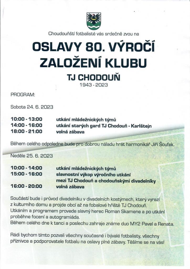 Fotbalisté TJ Chodouň srdečně zvou na "Oslavy 80. výročí založení klubu TJ Chodouň", které proběhnou v sobotu 24.6. a v neděli 25.6. 2023