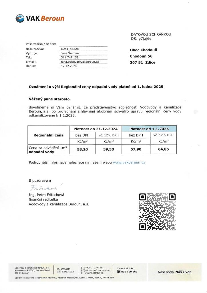 Oznámení o výši Regionální ceny odpadní vody platné od 1.1.2025