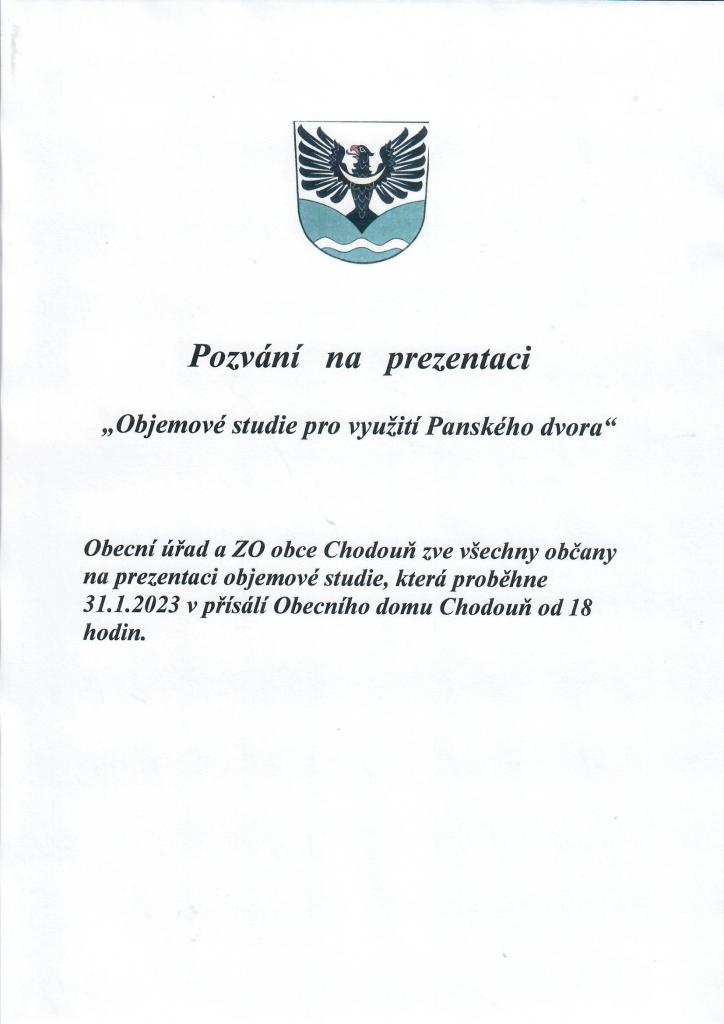 Pozvání na prezentaci "Objemové studie pro využití Panského dvora". Obecní úřad a ZO obce Chodouň zve všechny zájemce na prezentaci objemové studie, která proběhne 31.1.2023 od 18 hodin v přísálí OD.