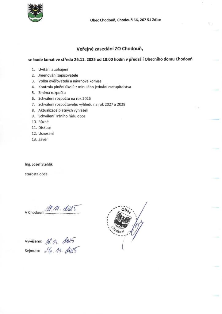 Veřejné zasedání ZO Chodouň 26.11.2025 od 18:00 hodin v Obecním domě Chodouň