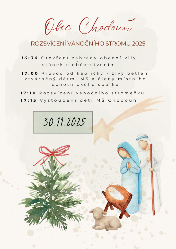 Rozsvícení vánočního stromu 30.11.2025 od 16:30 hodin v areálu Obecní vily Chodouň.