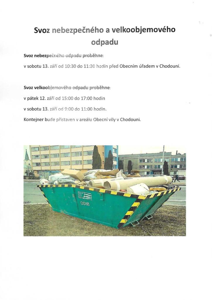 Připomínáme občanům svoz velkoobjemového a nebezpečného odpadu, který proběhne v září 12. a 13.