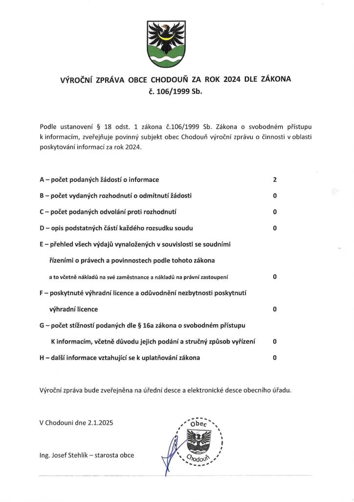 Výroční zpráva obce Chodouň za rok 2024 dle zákona č.106/1999 Sb.